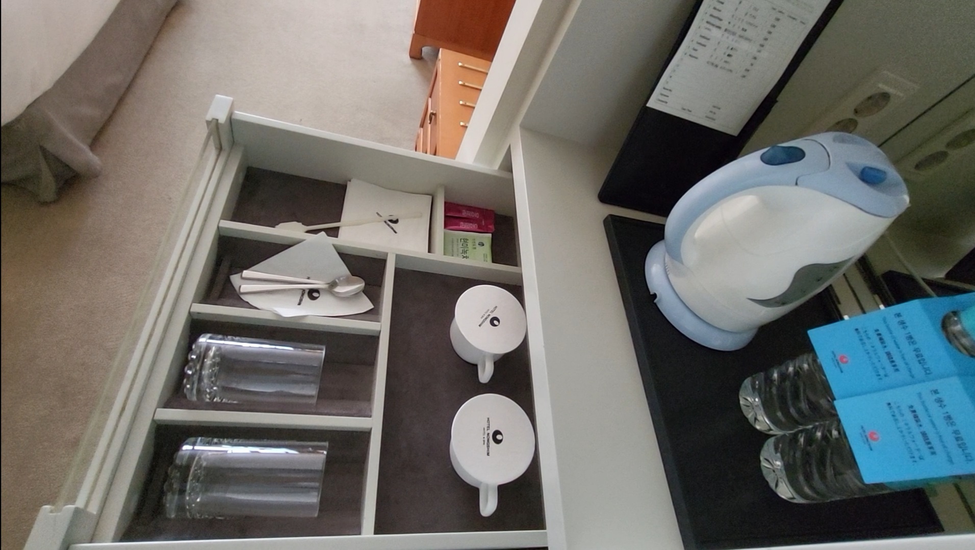 커피포트가 있고 서랍을 열면 커피잔, 유리컵, 커피와 차가 있습니다.
