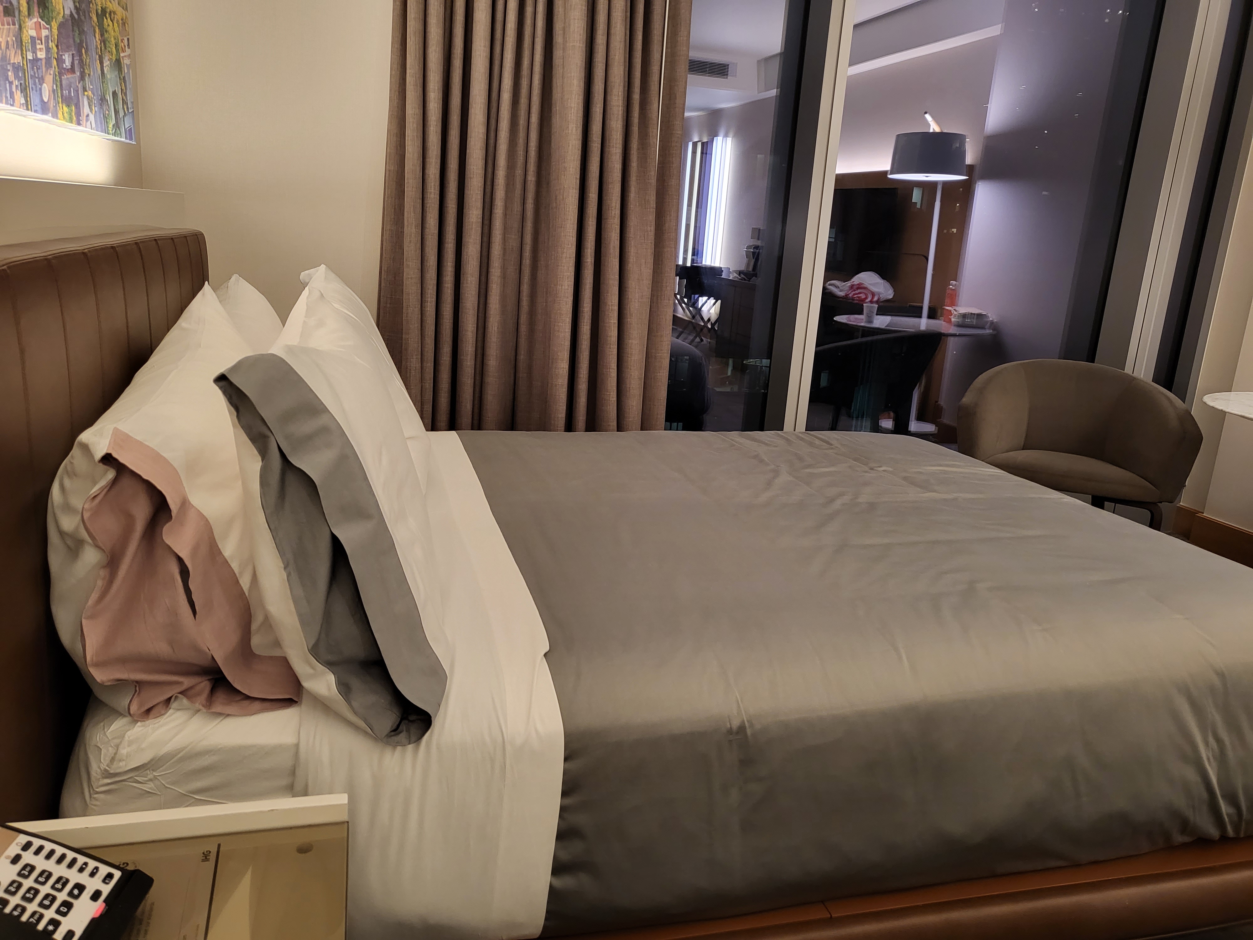 Usually hotel bedding is mostly white, but here, there was an extra layer of gray-toned comforter.
