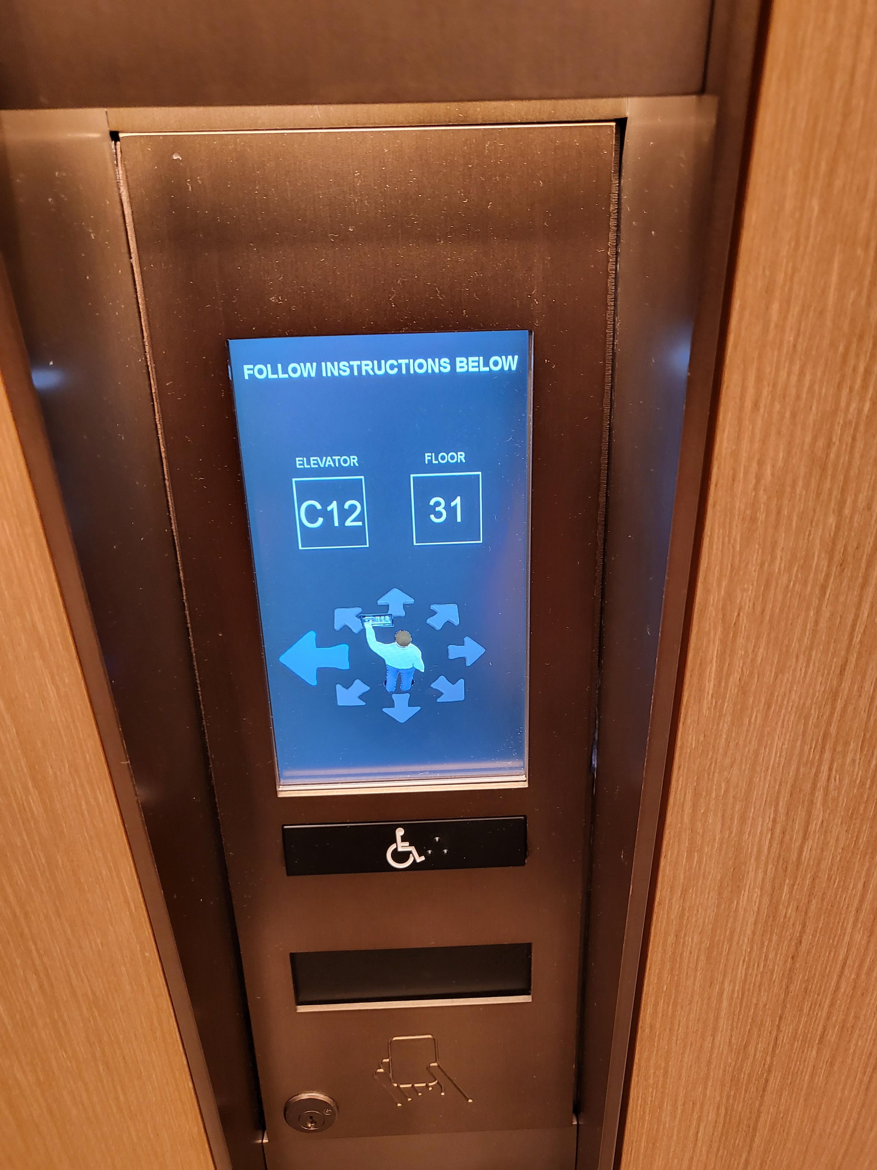 Don't panic, there's a keypad outside the elevator?! Just press the floor you want and get on the elevator that arrives.