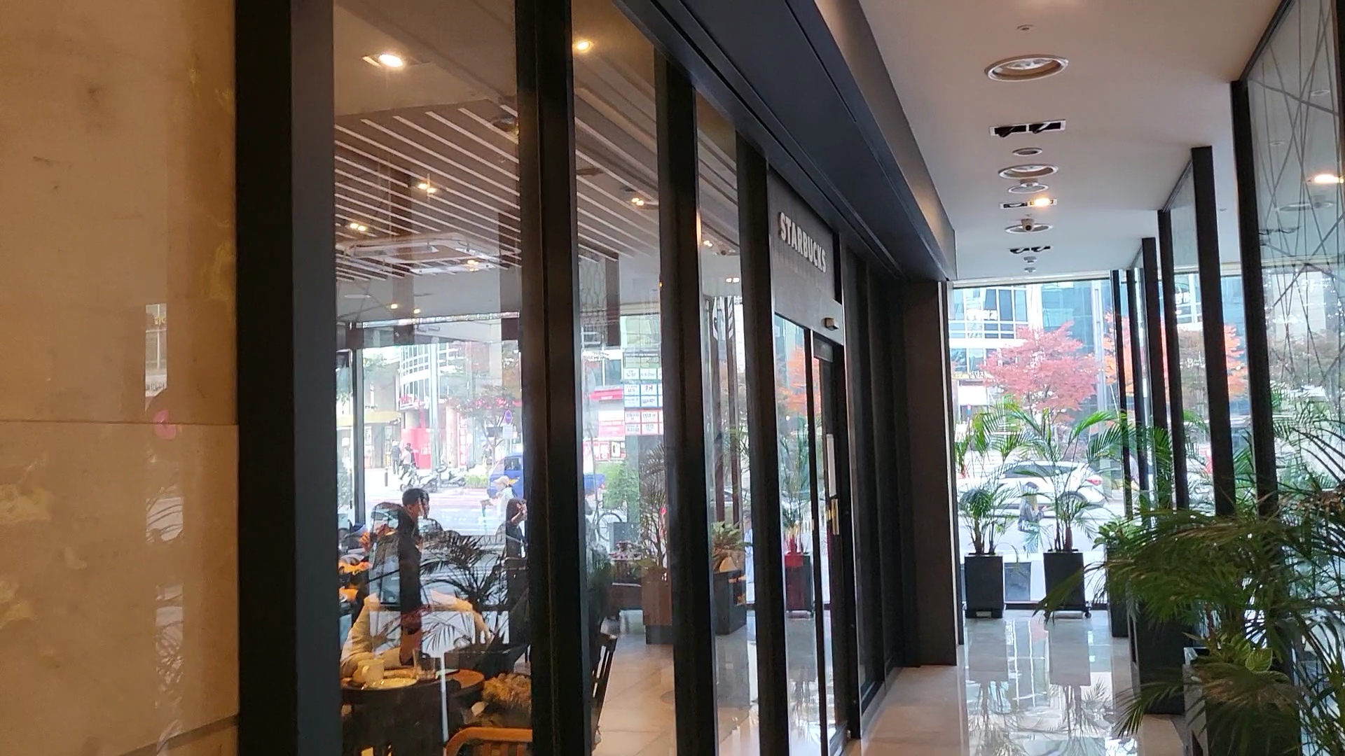 로비에 꽃집을 지나 계단을 올라가서 스타벅스로 들어갔습니다.