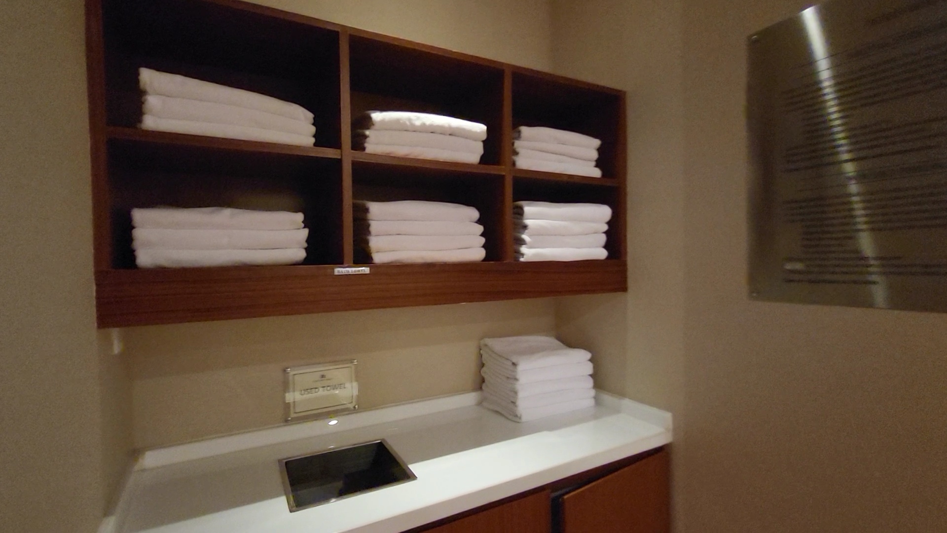 니코호텔 수영장과 헬스장도 둘러봤어요. 카운터에는 언제든지 사용할 수 있는 비치타올이 있었습니다.
