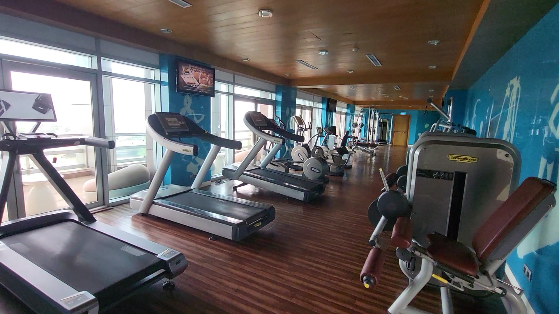 The air conditioning in the fitness center was set to a very high level, making it quite chilly. The spacious and comfortable environment contributed to excellent workout conditions.