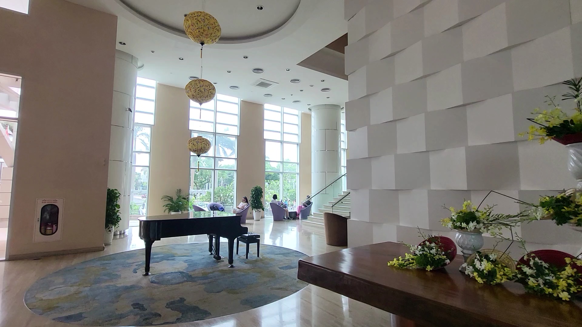 There was a piano in one corner of the hotel lobby, adorned with traditional Vietnamese hats and flower arrangements. To be honest, the flower arrangements seemed a bit sparse compared to the spacious setting and large tables.