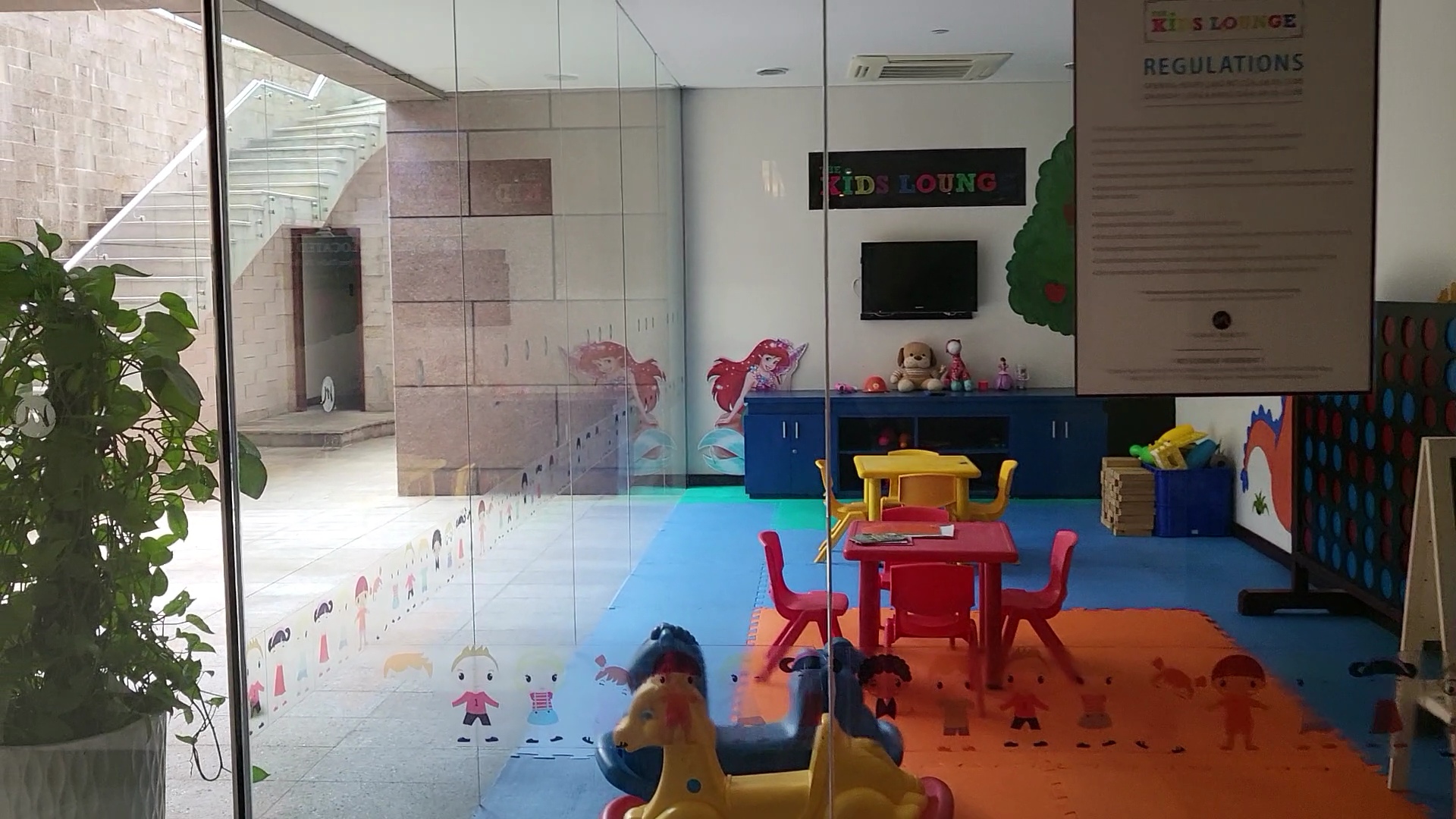 지하에는 탈의실이랑 키즈 라운지 있어요. 사진에서 보이는 계단으로 올라가면 수영장으로 연결되어 있어요.
