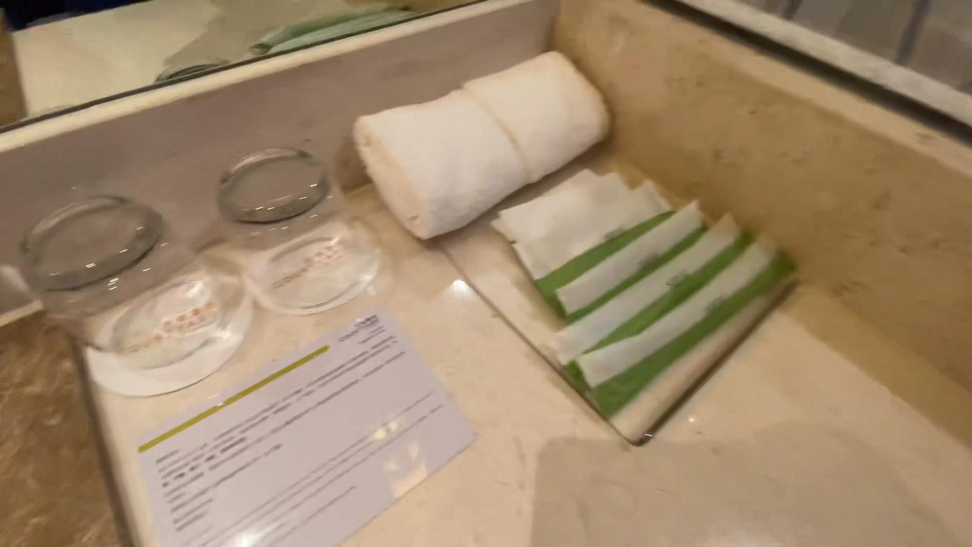 There were large-sized bottles of shower gel, shampoo, conditioner, soap, body lotion, along with a hairdryer, shower gown, and slippers.
