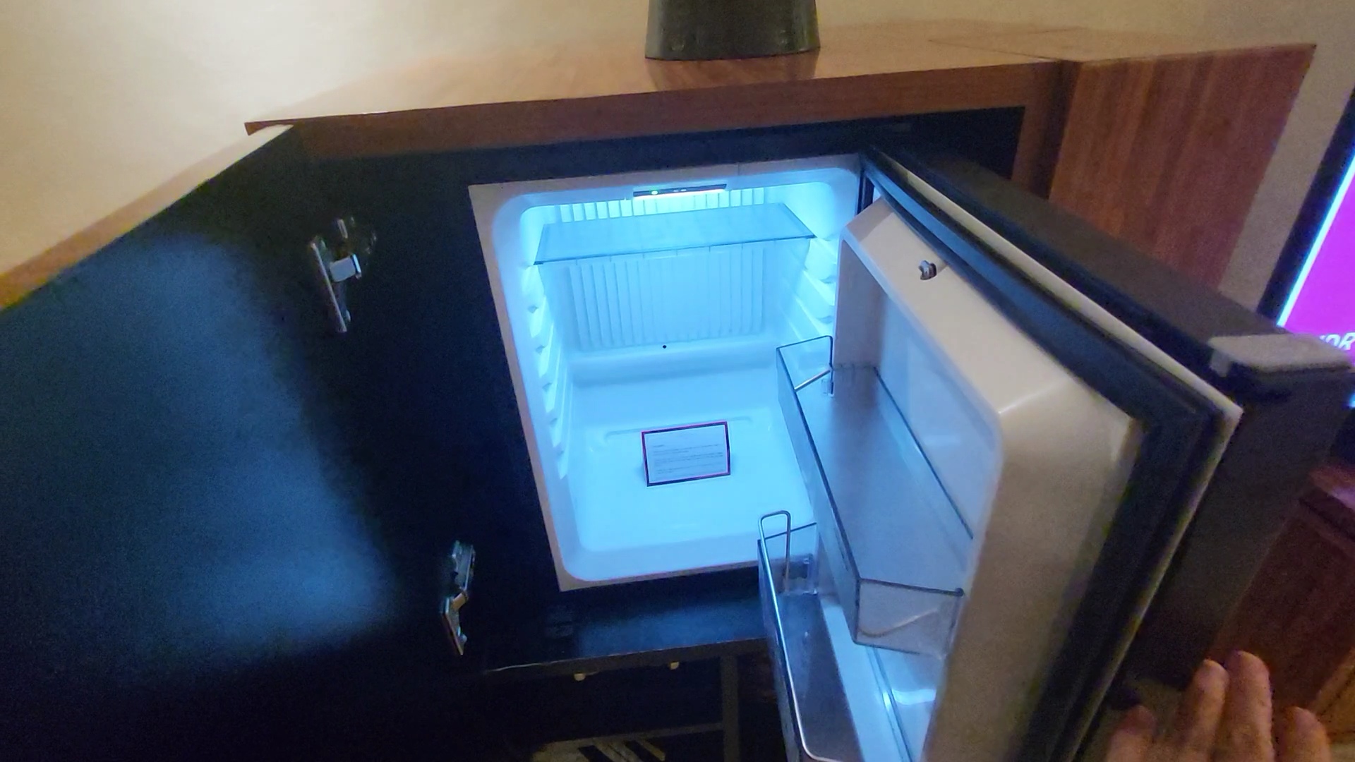 There is a mini-fridge, a coffee pot, cups, and other amenities in the room.
