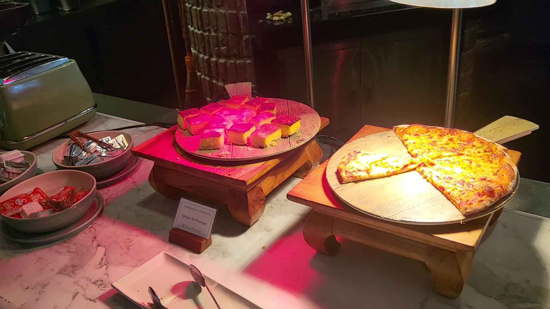 Beverages are served by the staff who take your order. I tried a pink Indonesian dessert recommended by the hotel staff, and it had a texture similar to rice cakes.