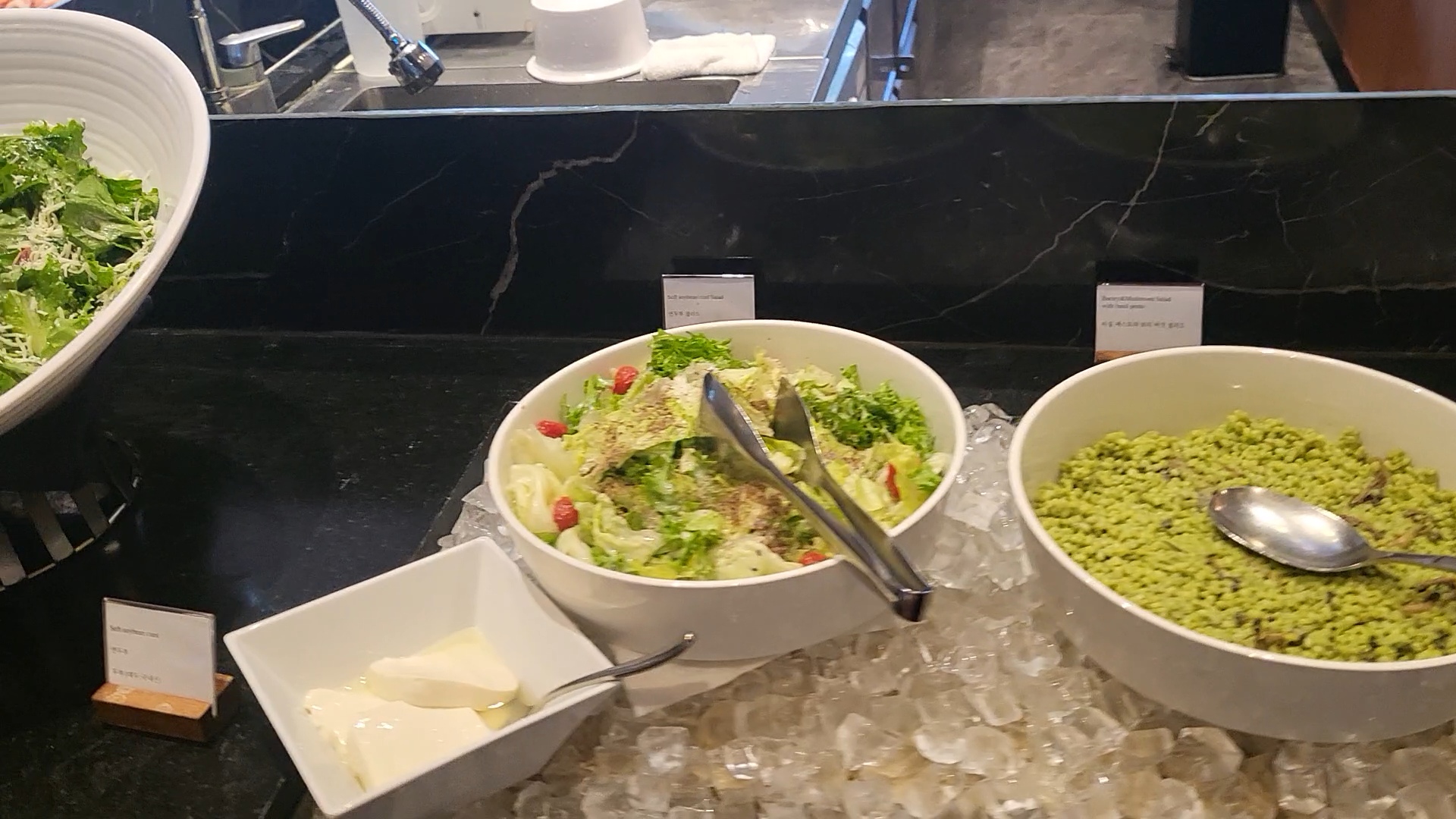 샐러드 코너에는 신선한 야채들, 치즈, 햄, 시저샐러드, 바질보리가 있었습니다.