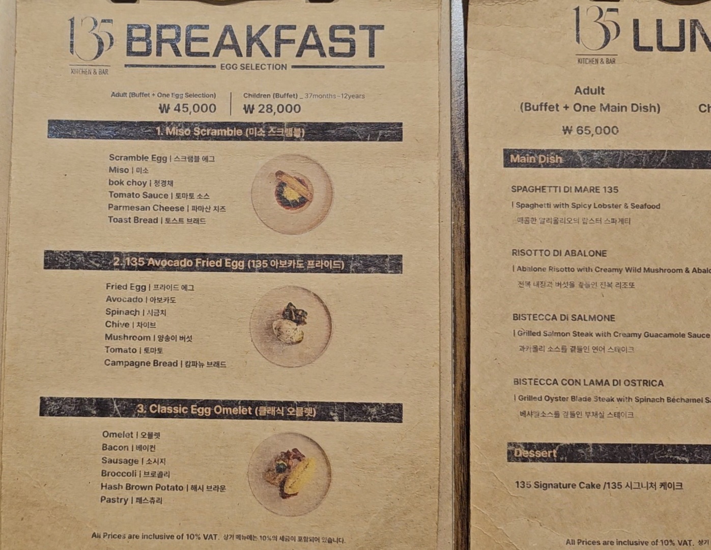 135 키친앤 바 조식은 런치와 동일하게 메인요리가 한가지씩 더 나오네요.