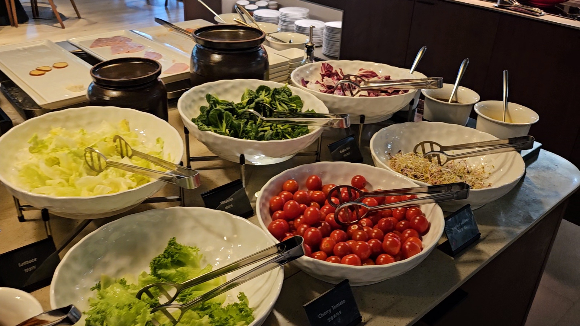 한식반찬, 신선한 샐러드, 라면, 쌀국수.