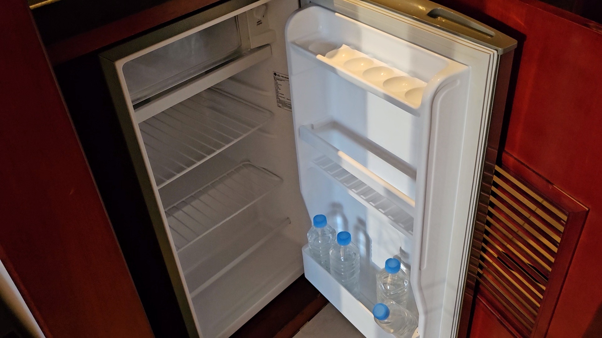 Four bottles of water are complimentary. The refrigerator is quite large.