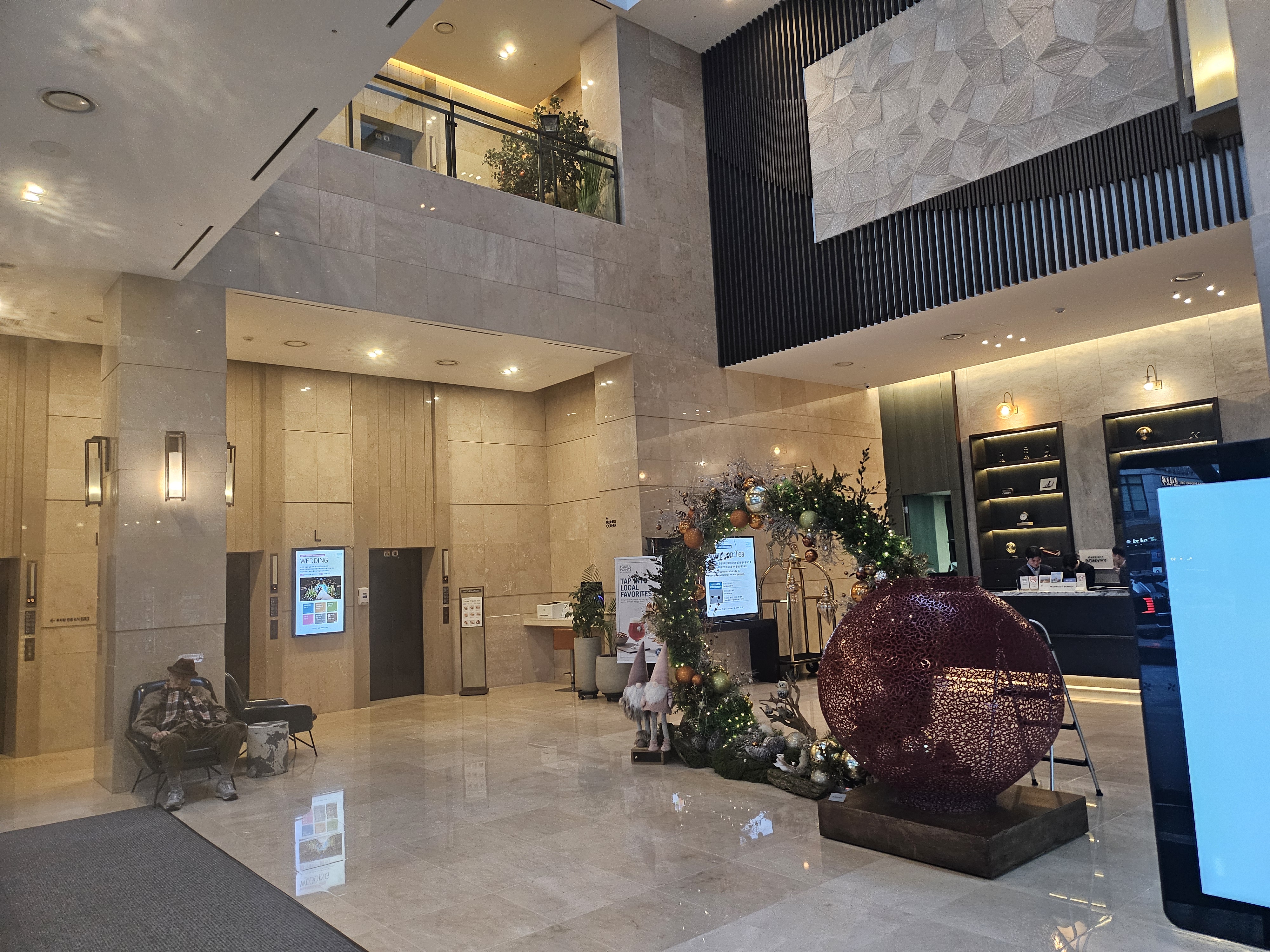로비 장식은 매번 바뀌는데, 이번 장식은 크리스마스 느낌이 나는 대형 리스가 세워져 있네요.