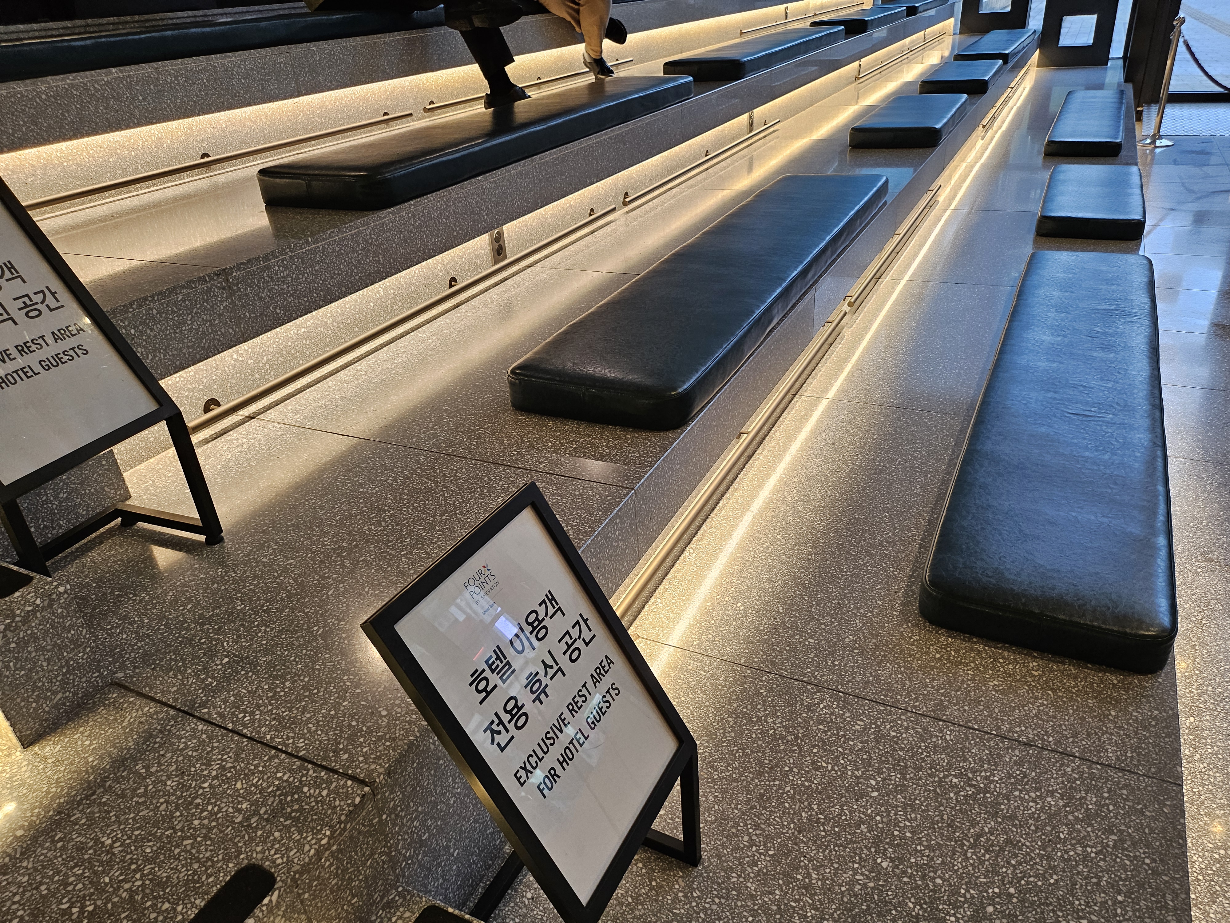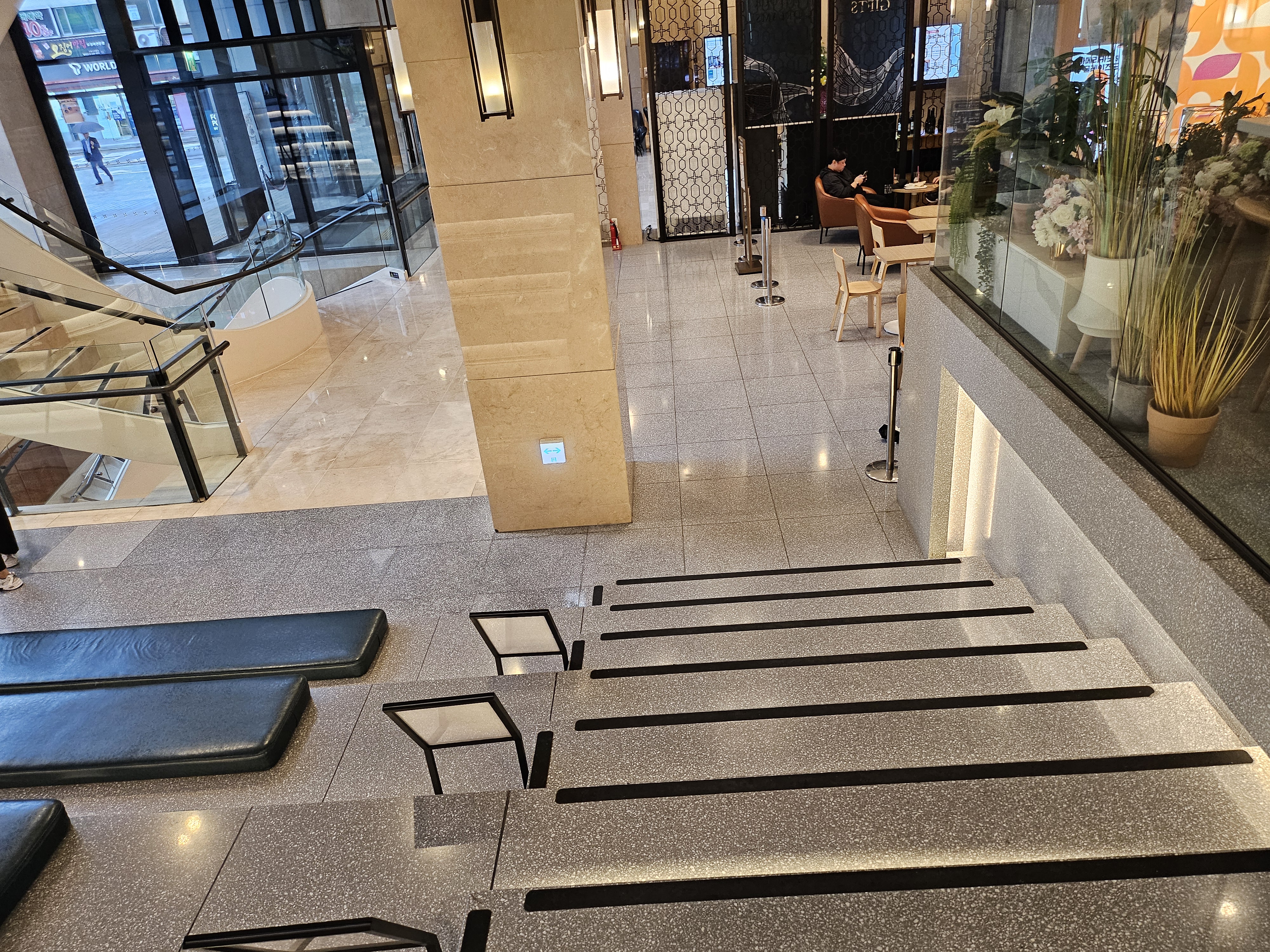 카페 안 자리가 없으면 호텔 내부 계단에 앉을 자리가 마련되어 있습니다.